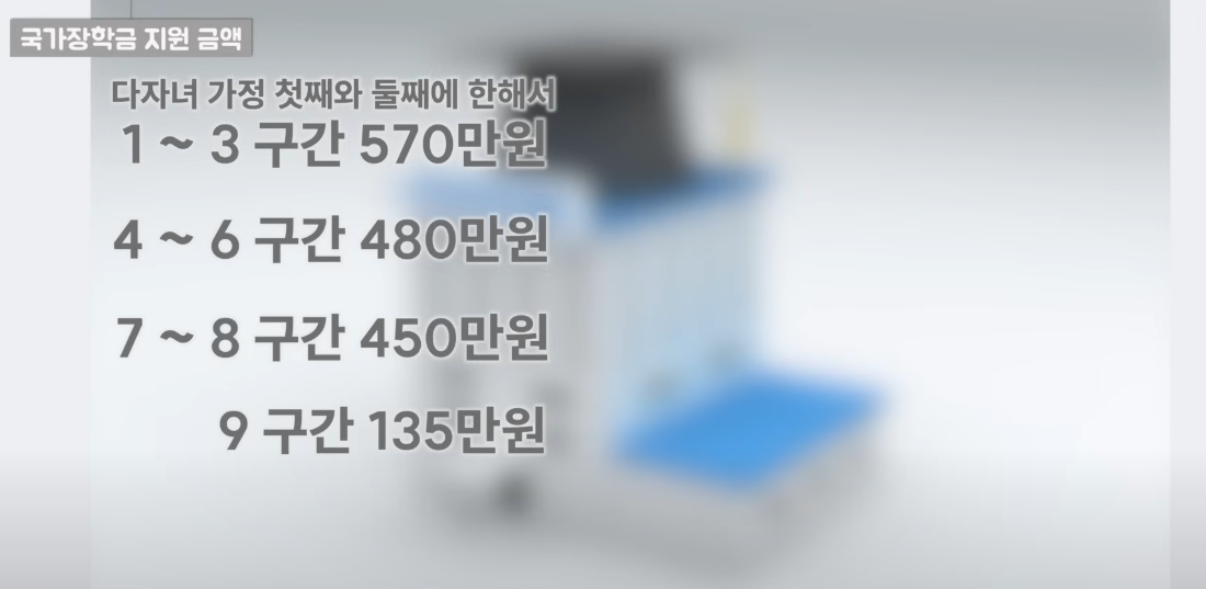 위 표에서 볼 수 있듯이, 1유형의 경우 1~3구간의 학생들은 연간 570만 원을 지원받을 수 있으며, 4~6구간은 420만 원, 7~8구간은 350만 원이 지원됩니다. 특히 9구간의 경우 지원 금액이 100만 원으로 상대적으로 낮습니다. 반면, 다자녀 가정의 경우 첫째와 둘째 자녀는 1~3구간에서 570만 원, 4~6구간에서 480만 원, 7~8구간에서 450만 원을 지원받습니다. 9구간의 경우에도 135만 원이 지원되며, 셋째 자녀부터는 8구간까지 전액 지원이 이루어집니다 .