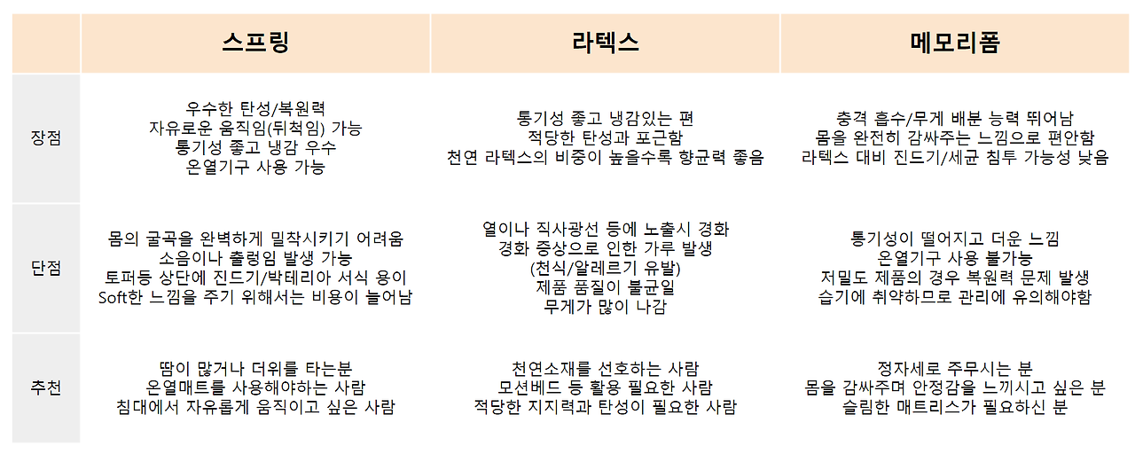 아래의 표를 통해 각 매트리스의 장단점을 비교해 볼 수 있어요.