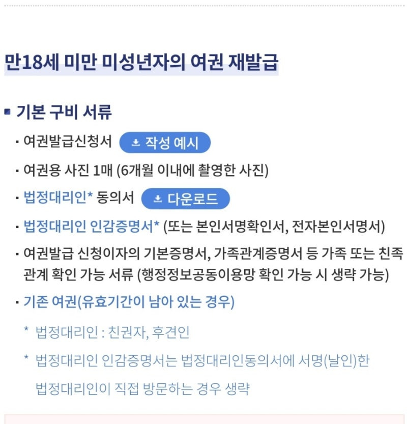 이 외에도 추가적인 서류가 필요할 수 있으니, 반드시 확인하고 준비해 주시기 바랍니다. 아래 이미지는 미성년자 여권 발급을 위한 필수 서류 목록을 보여줍니다.